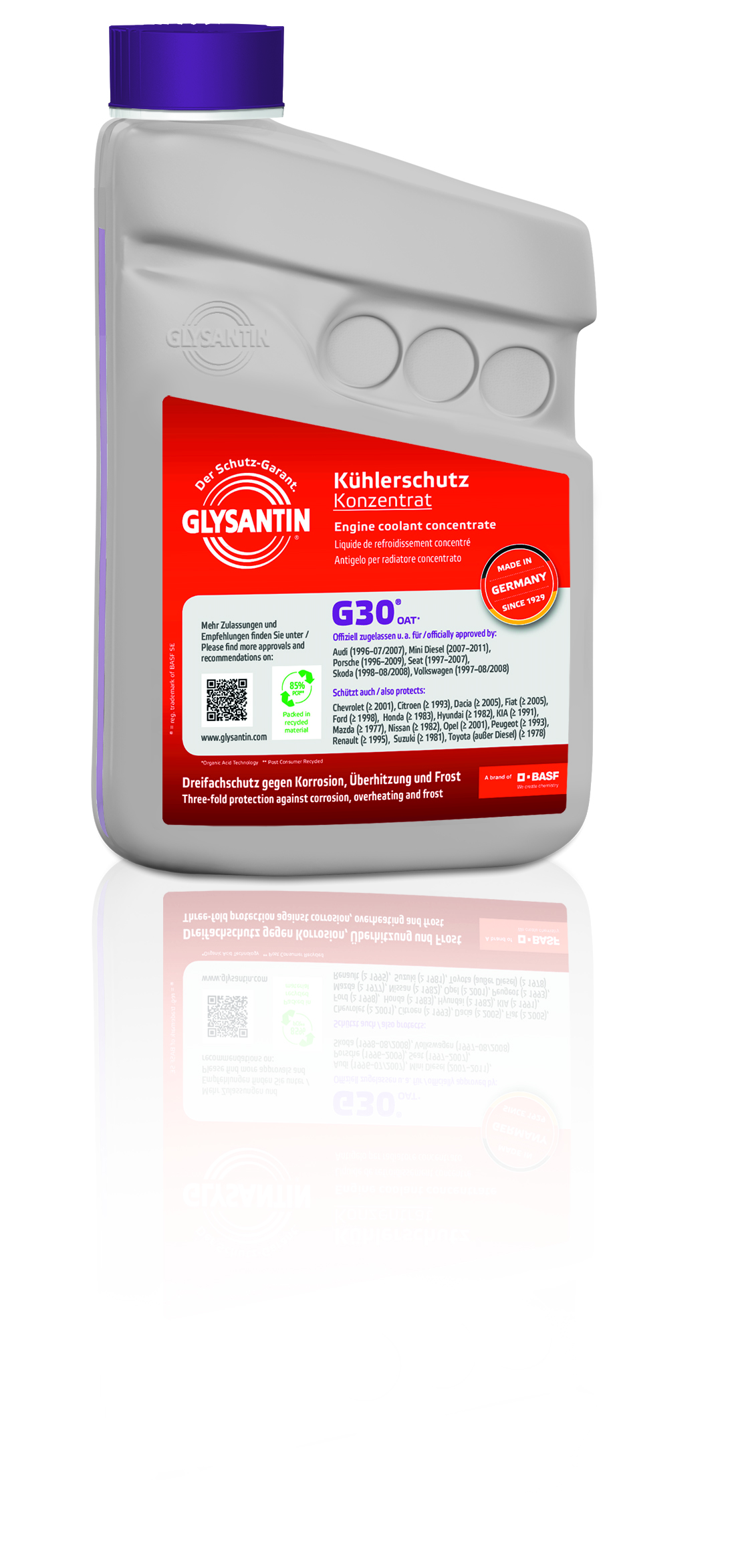 GLYSANTIN® G30® ist ein silikatfreies Premium-Kühlerschutzmittel aus der GLYSANTIN®- Serie. Bei diesem Kühlerschutzmittel kommt die sogenannte OAT-Technologie zum Einsatz. Dabei sind organische Salze für den Schutz vor Kühlerkorrosion verantwortlich. Die Produktfarbe von GLYSANTIN® G30® ist pink.